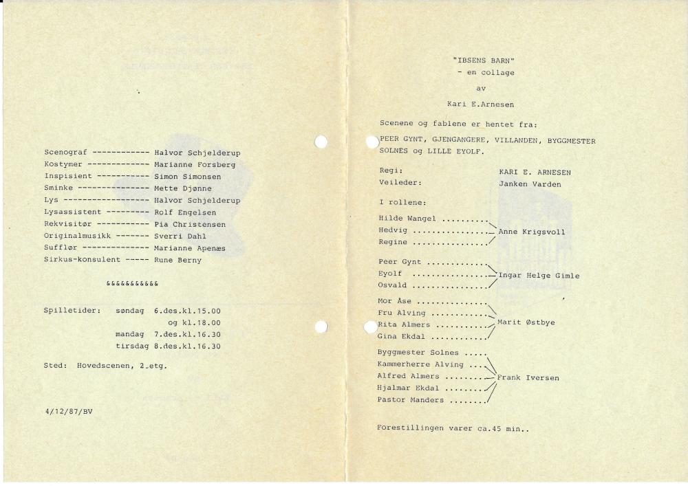 Program til Statens teaterhøgskoles produksjon Ibsens barn - en collage (1987).