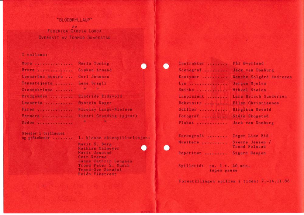 Program til Statens teaterhøgskoles produksjon Blodbryllaup med 3.klasse skuespillerlinjen (1986).