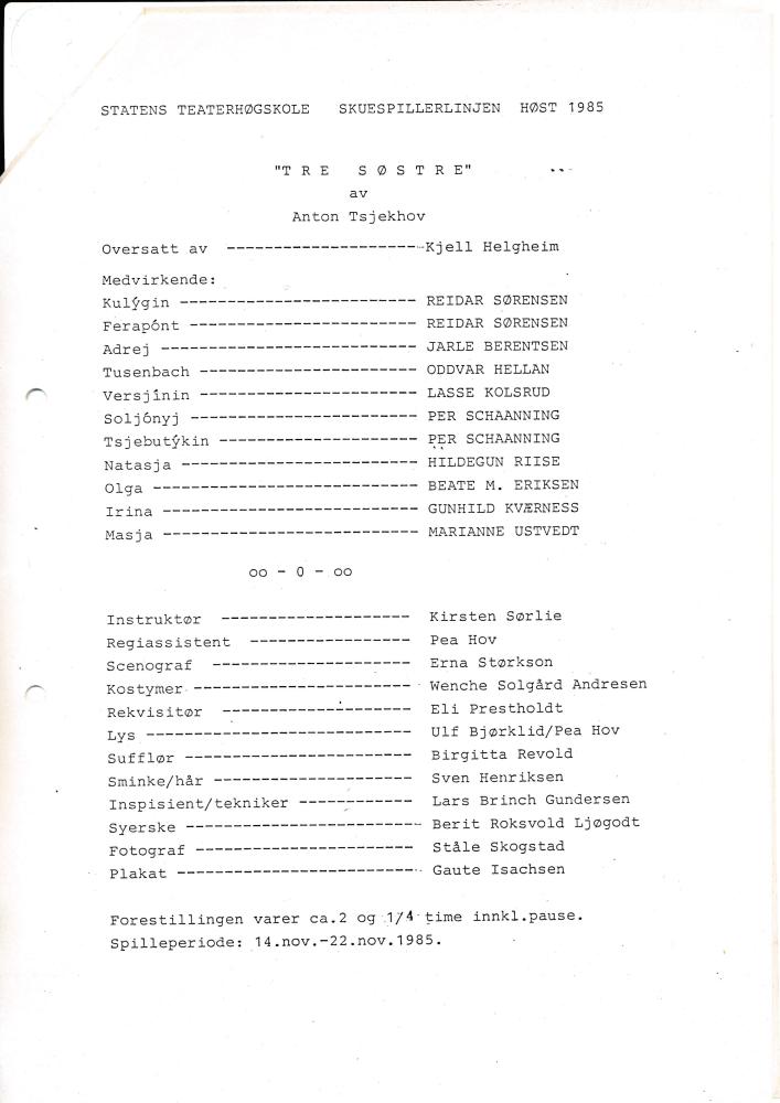 Program til Statens teaterhøgskoles produksjon Tre søstre (1985).