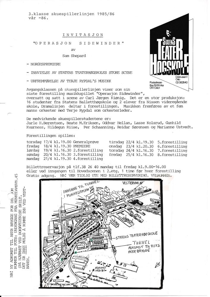 Invitasjon til Statens teaterskoles studentvisning Operasjon Sidewinder med 3.klasse skuespillerlinjen og gjester (1986)