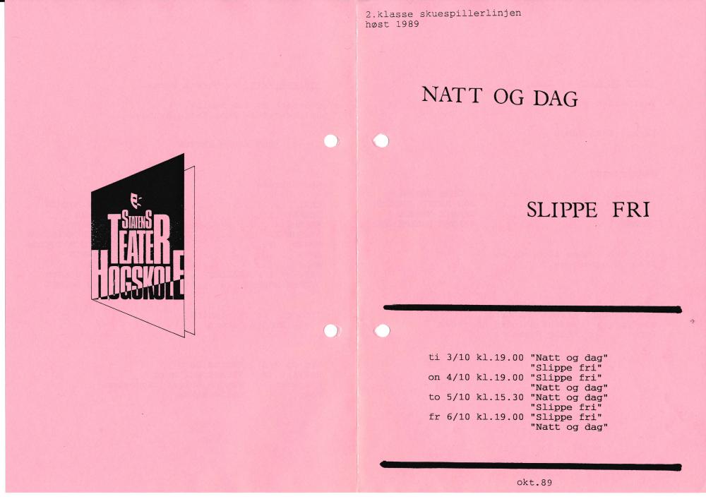 Program til Statens teaterhøgskoles studentproduksjon Natt og dag (1989)