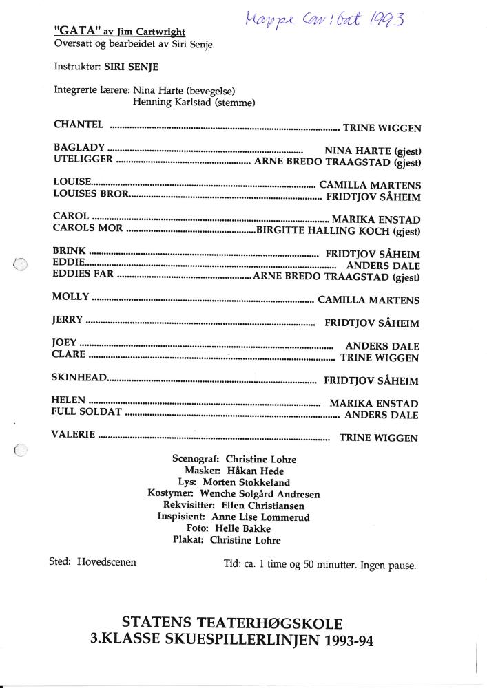 Program til Statens teaterskoles produksjon Gata med studenter fra 3.klasse skuespillerlinjen (1993)