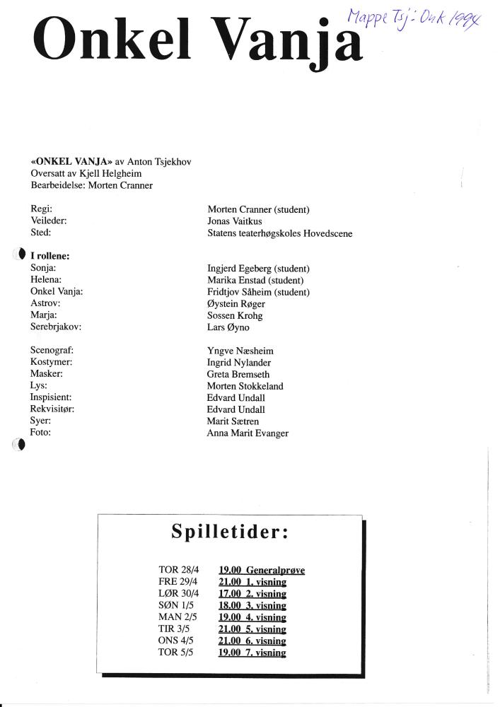 Program til Statens teaterhøgskoles avgangsproduksjon Onkel Vanja, side 1 (1994)