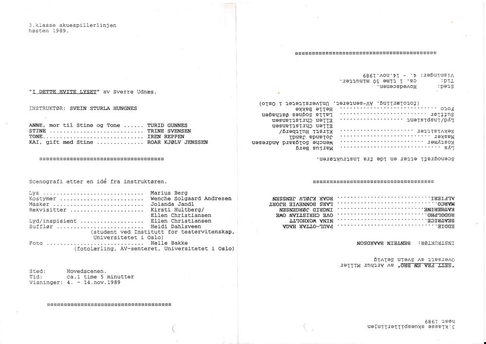 Program til Statens teaterhøgskoles studentproduksjon I dette hvite lyset (1989).