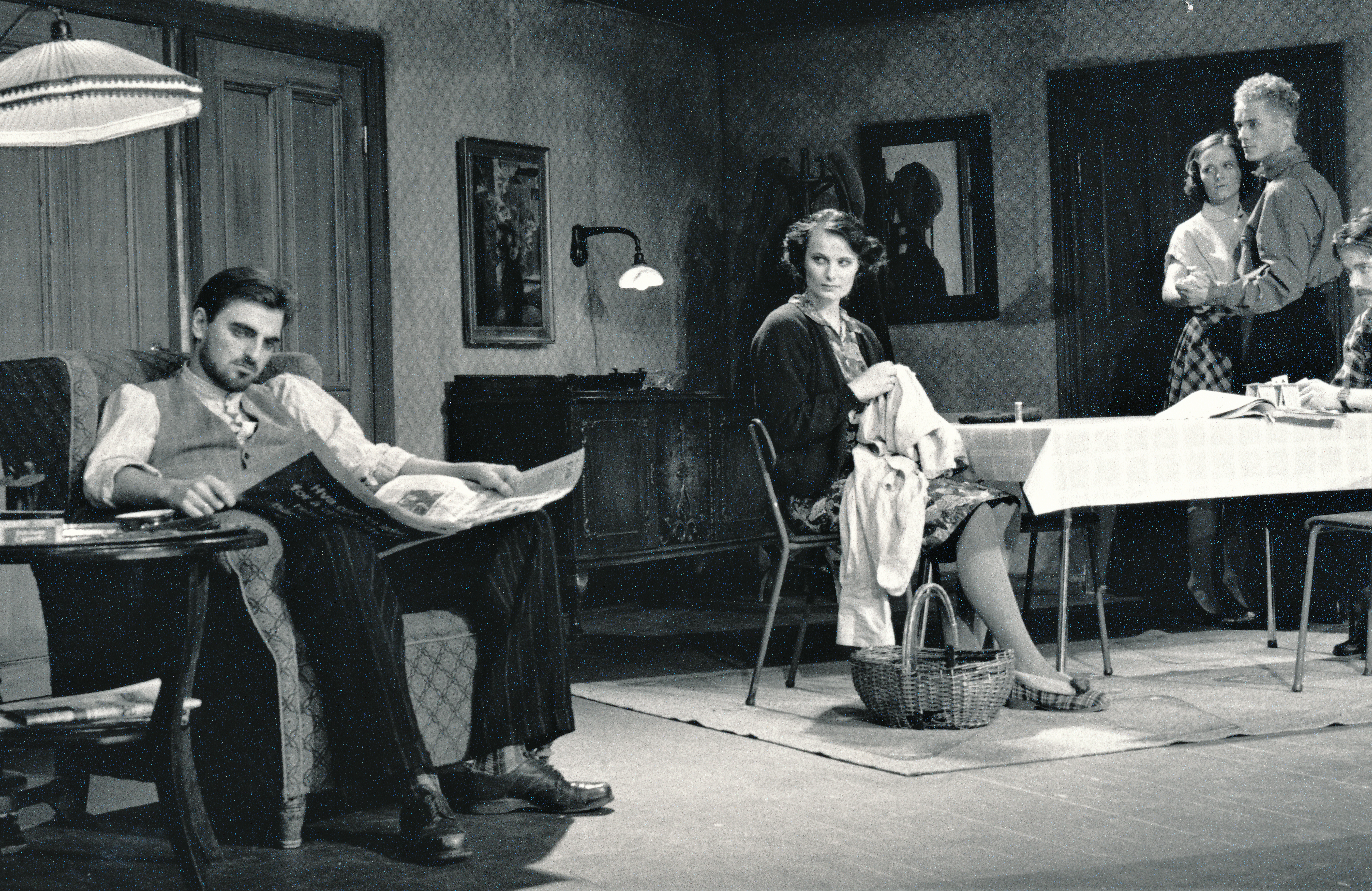 Fotografi fra Statens teaterhøgskoles studentproduksjon Sett fra en bro med 3.klasse skuespillerlinjen (1989).