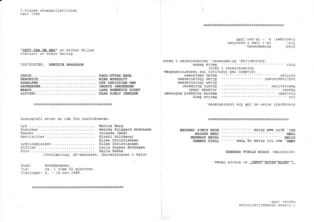 Program til Statens teaterhøgskoles produksjon Sett fra en bro med 3.klasse skuespillerlinjen (1989).