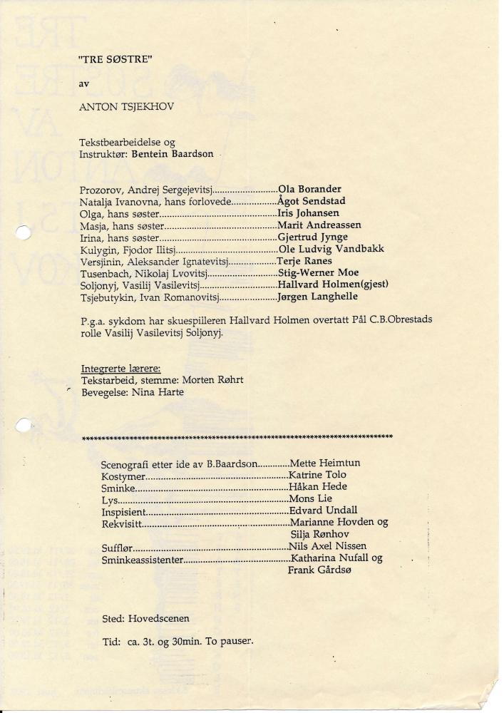 Program til Statens teaterhøgskoles studentproduksjon Tre søstre (1992).