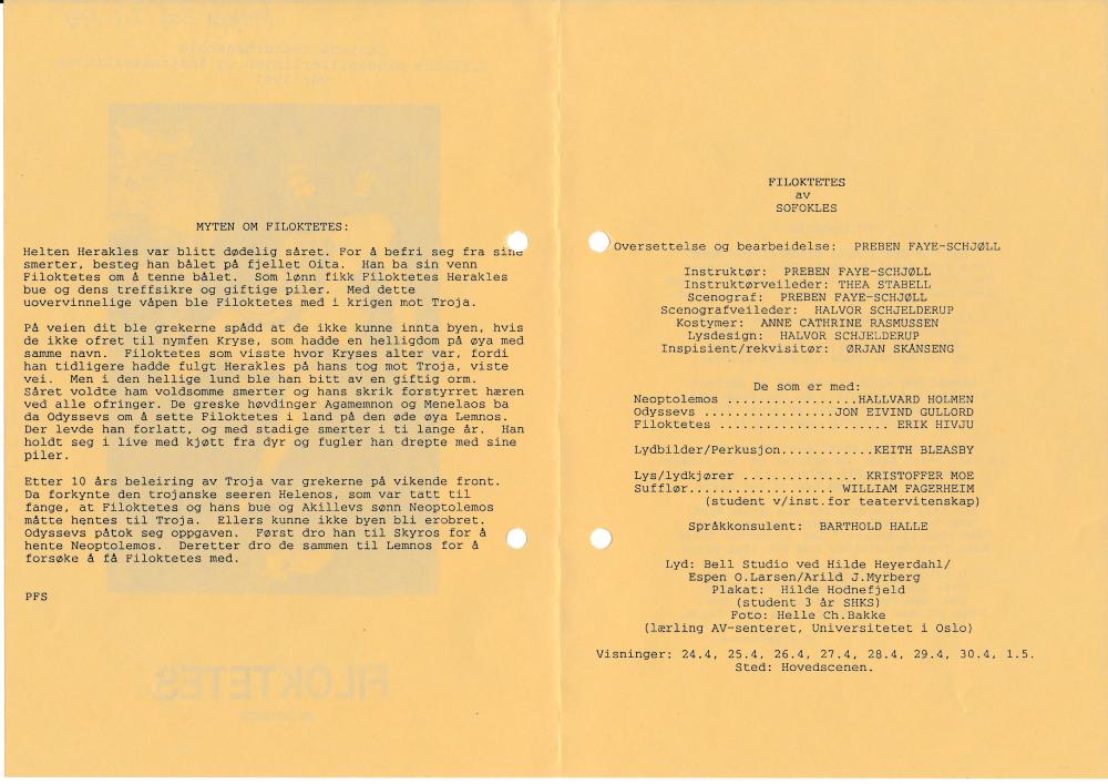 Program til Statens teaterhøgskoles avgangsproduksjon Filoktetes med studenter fra 3.klasse instruktørlinjen, 3.klasse skuespillerlinjen og profesjonelle skuespillere (1991)