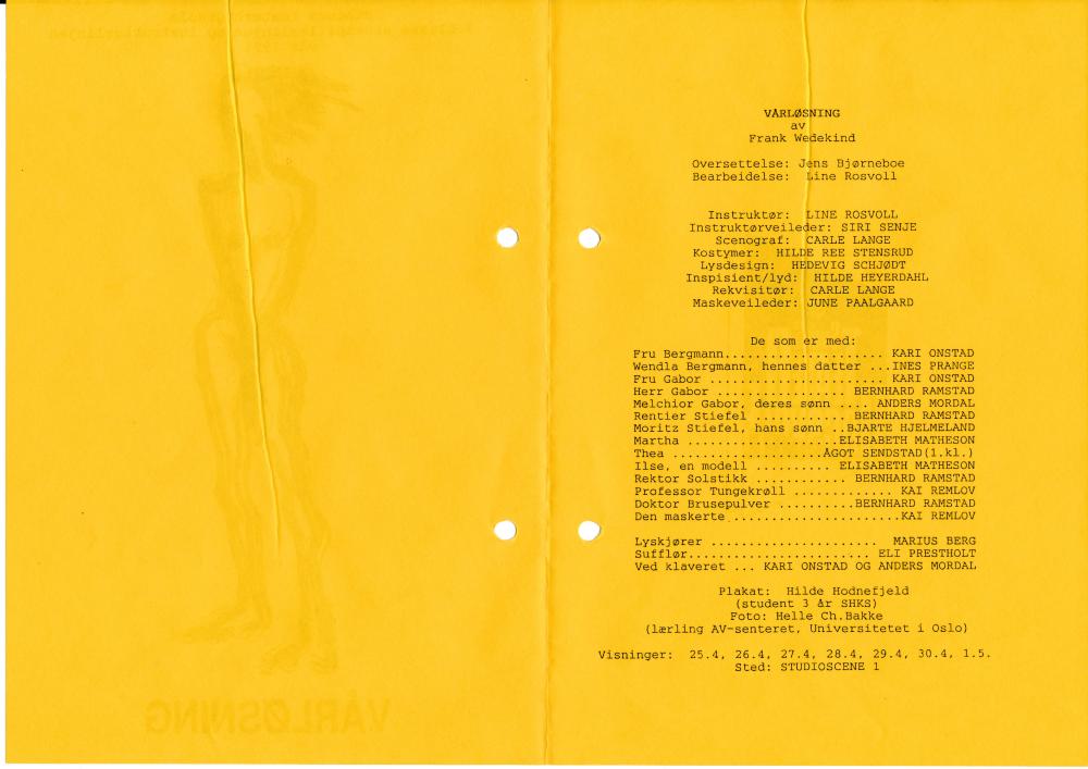 Program til Statens teaterhøgskoles avgangsproduksjon Vårløsning med studenter fra 3.klasse instruktørlinjen, 3.klasse skuespillerlinjen og profesjonelle skuespillere (1991)