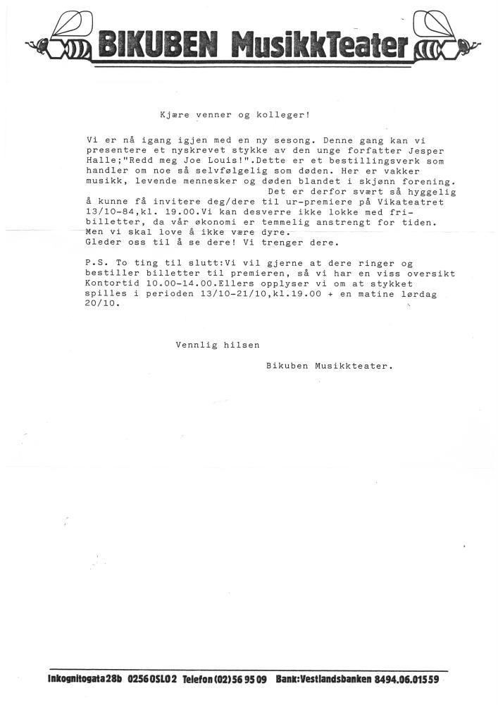 Invitasjon til urfremførelsen av Bikuben Musikkteaters produksjon Redd meg Joe Louis! (1984).