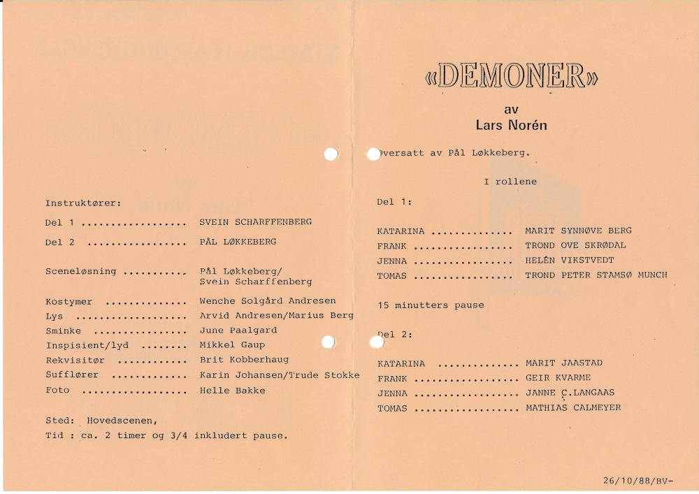 Program til Statens teaterhøgskoles studentproduksjon Demoner (1988).