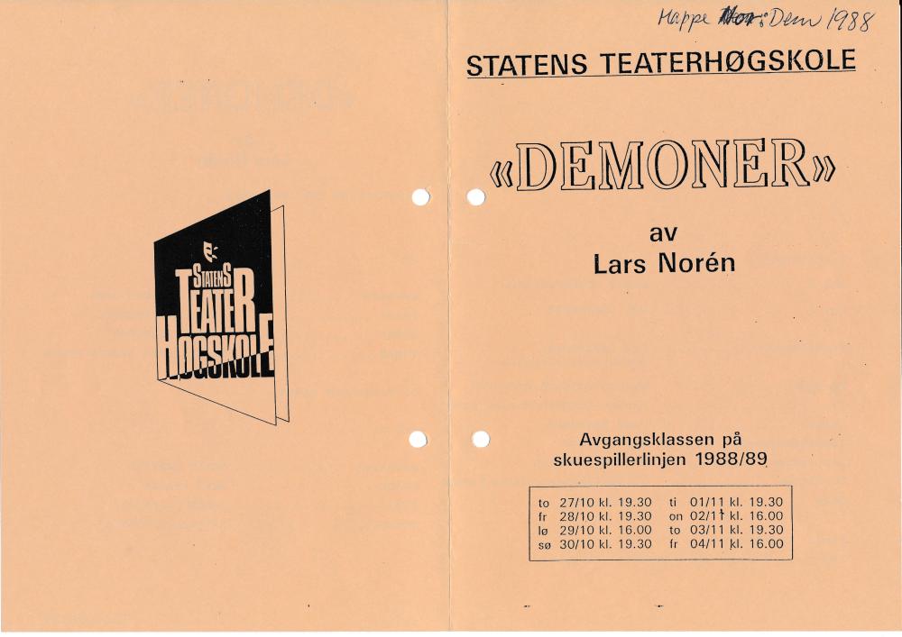 Program til Statens teaterhøgskoles studentproduksjon Demoner (1988).