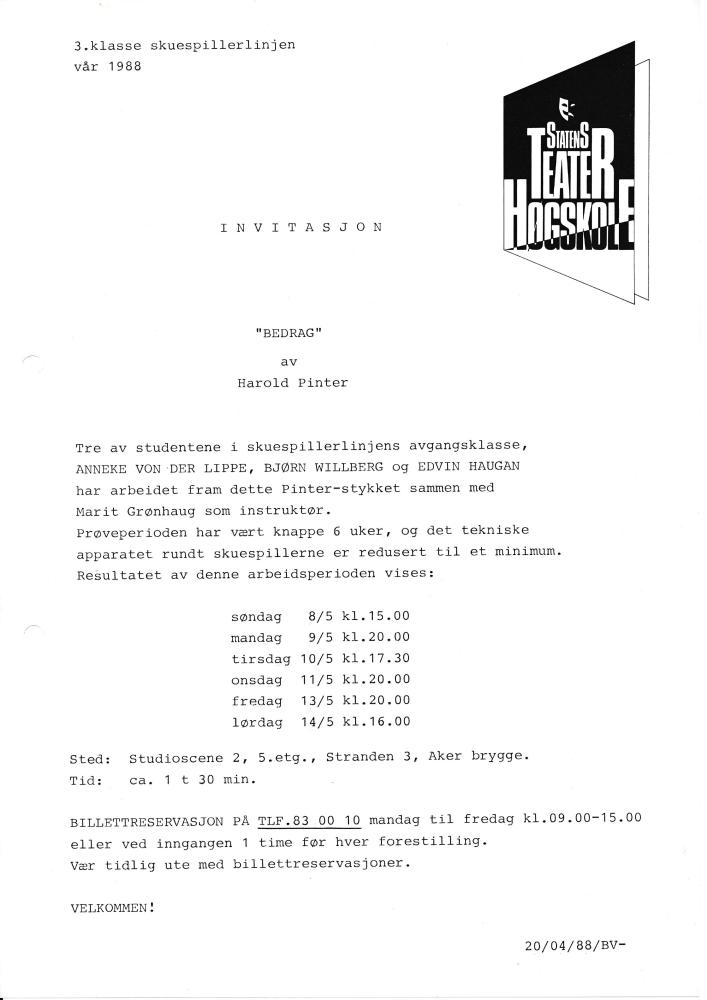 Invitasjon til Statens teaterhøgskoles studentproduksjon Bedrag med studenter fra 3.klasse skuespillerlinjen(1988)