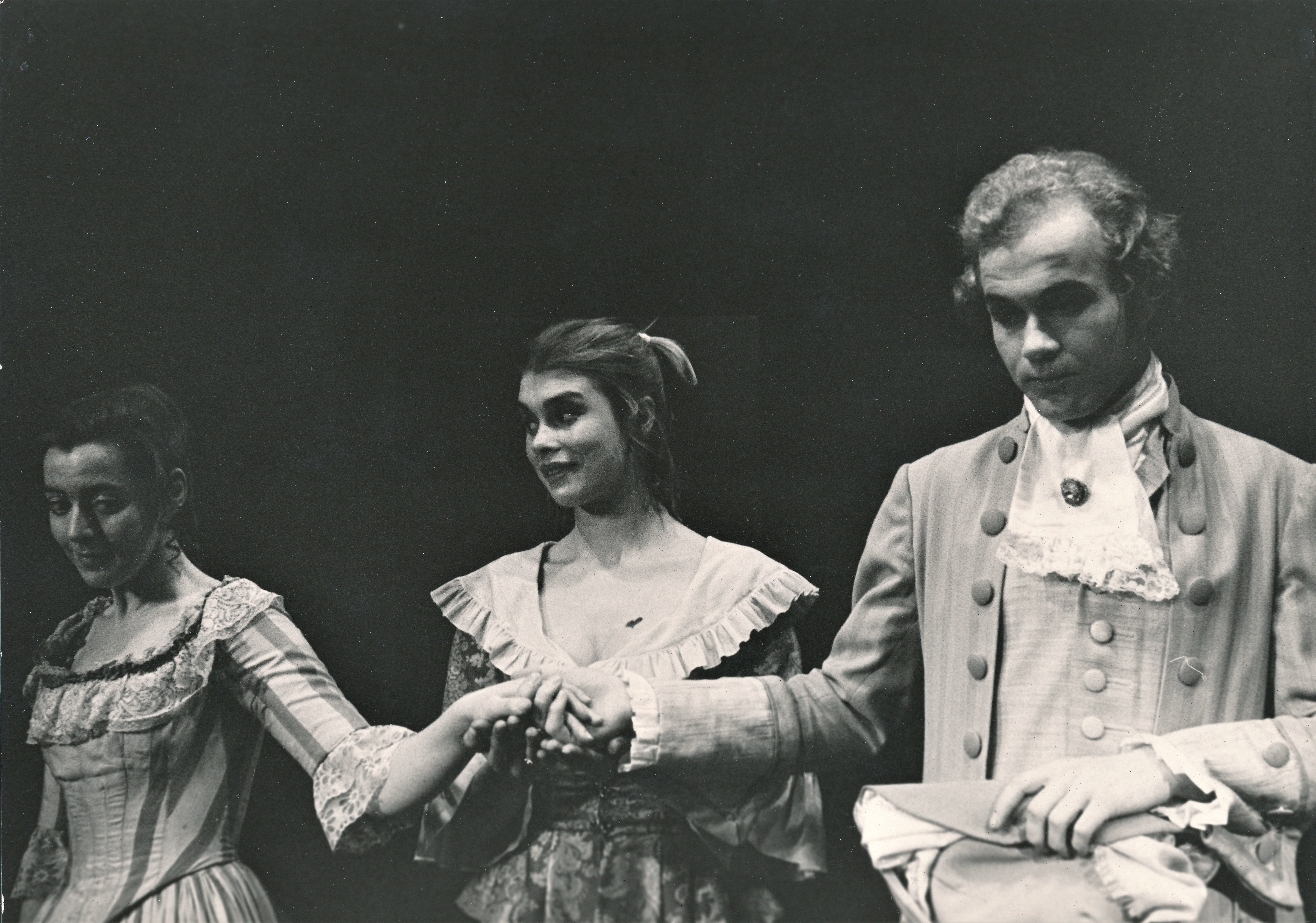 Fotografi fra Statens teaterskoles elevvisning med scener fra Tartuffe (1975)