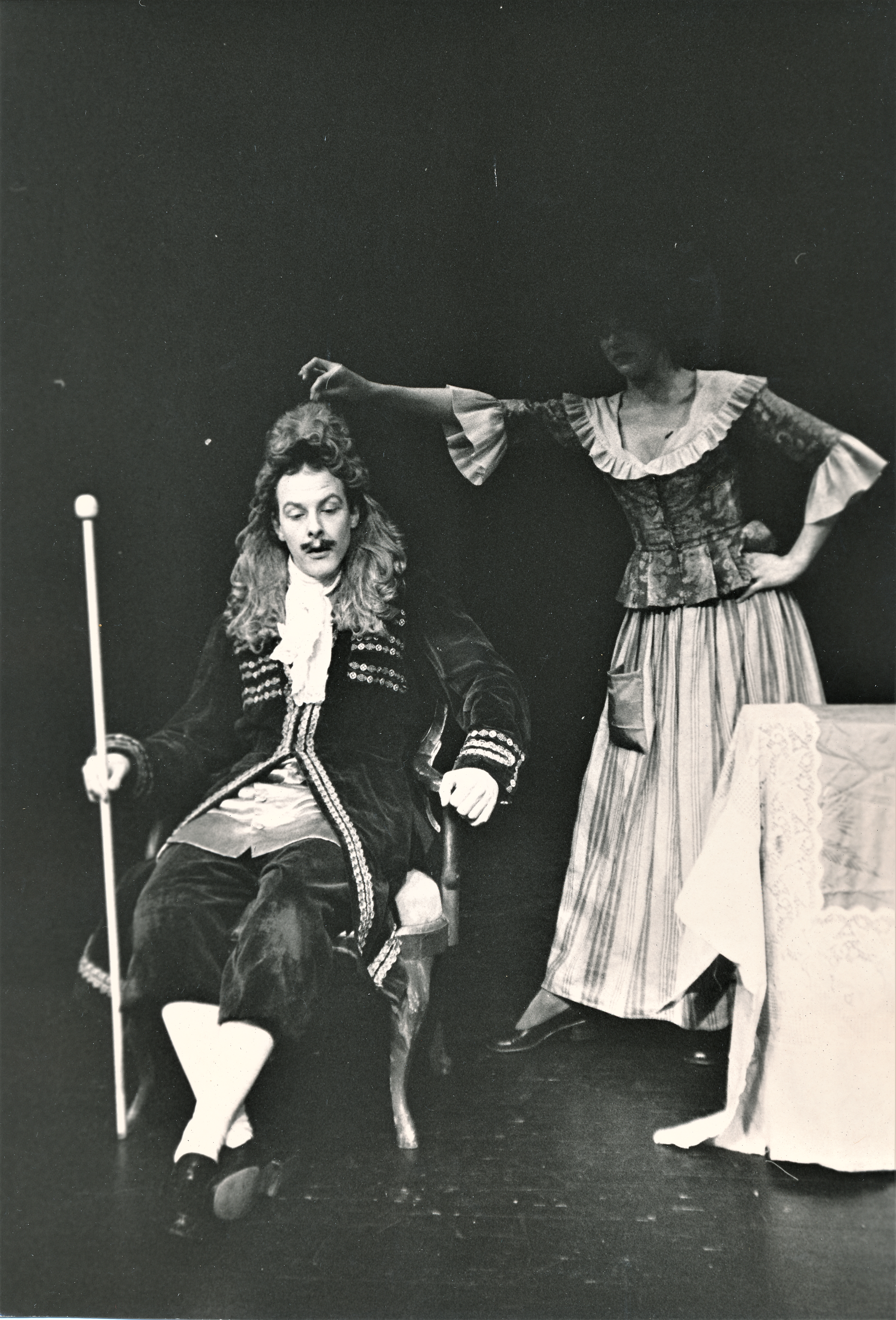 Fotografi fra Statens teaterskoles elevvisning med scener fra Tartuffe (1975)