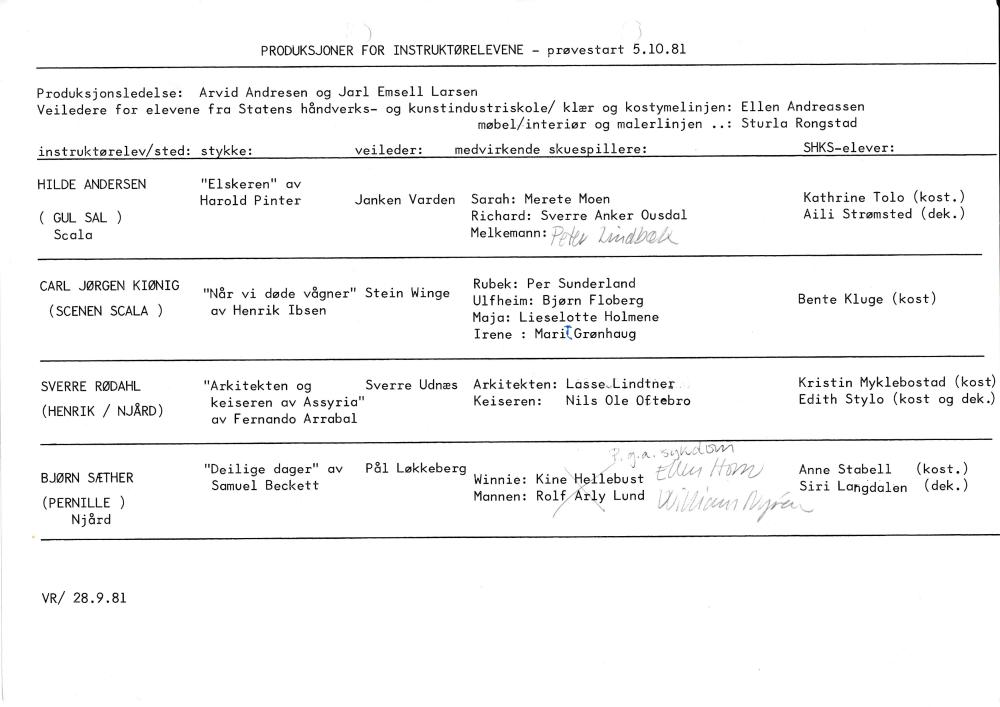 Produksjonsoversikt Statens teaterskoles instruktørlinje (1981)