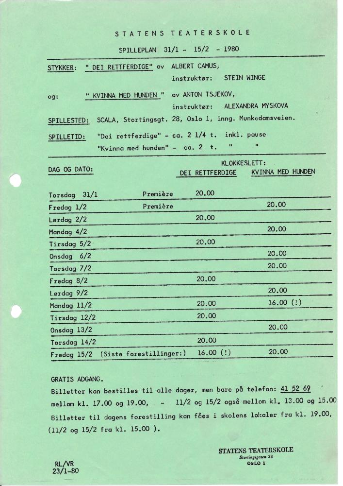 Spilleplan for Statens teaterskoles elevvisninger av Dei rettferdige og Kvinna med hunden (1980)