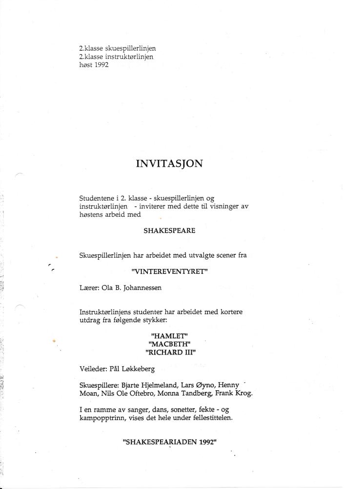 Invitasjon til Statens teaterhøgskoles studentproduksjon Shakespeariaden 1992, inkludert Vintereventyret (1992), side 1.