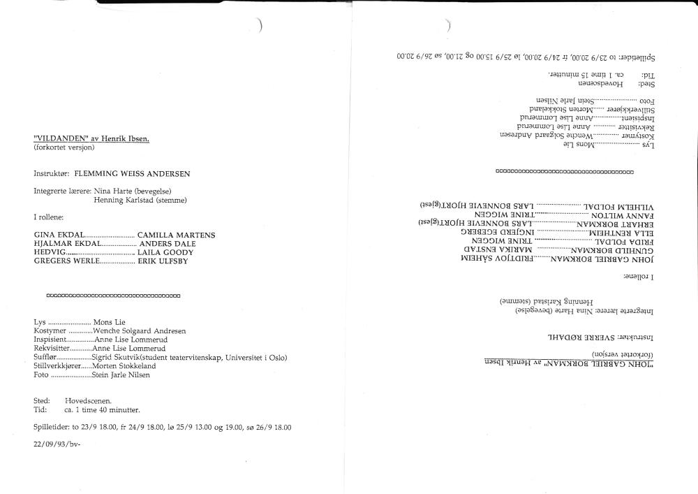 Program til Statens teaterhøgskoles studentproduksjoner Vildanden og John Gabriel Borkman med 3.klasse skuespillerlinjen (1993)
