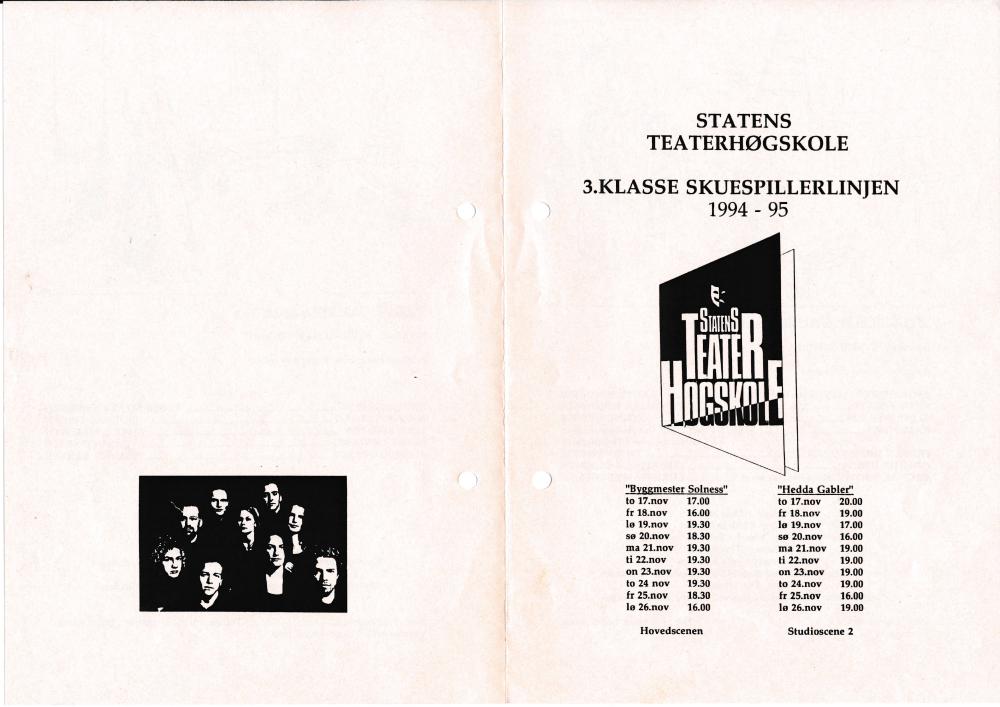 Programforside til Statens teaterhøgskolen studentproduksjon Byggmester Solness og Hedda Gabler (1994)