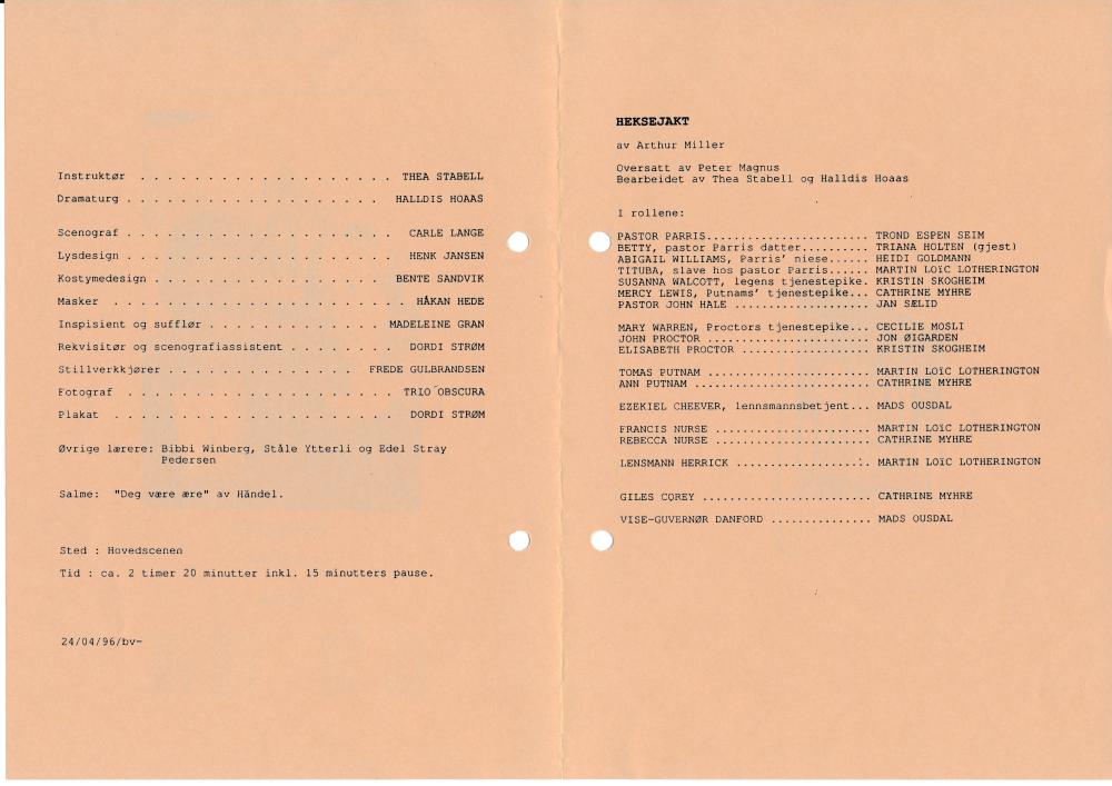 Program til Statens teaterhøgskoles studentproduksjon Heksejakt med 3.klasse skuespillerlinjen (1996).