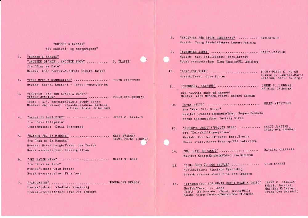 Program til Statens teaterhøgskoles musikal- og sangprogram Hummer & Kanari med 3.klasse skuespillerlinjen (1989)