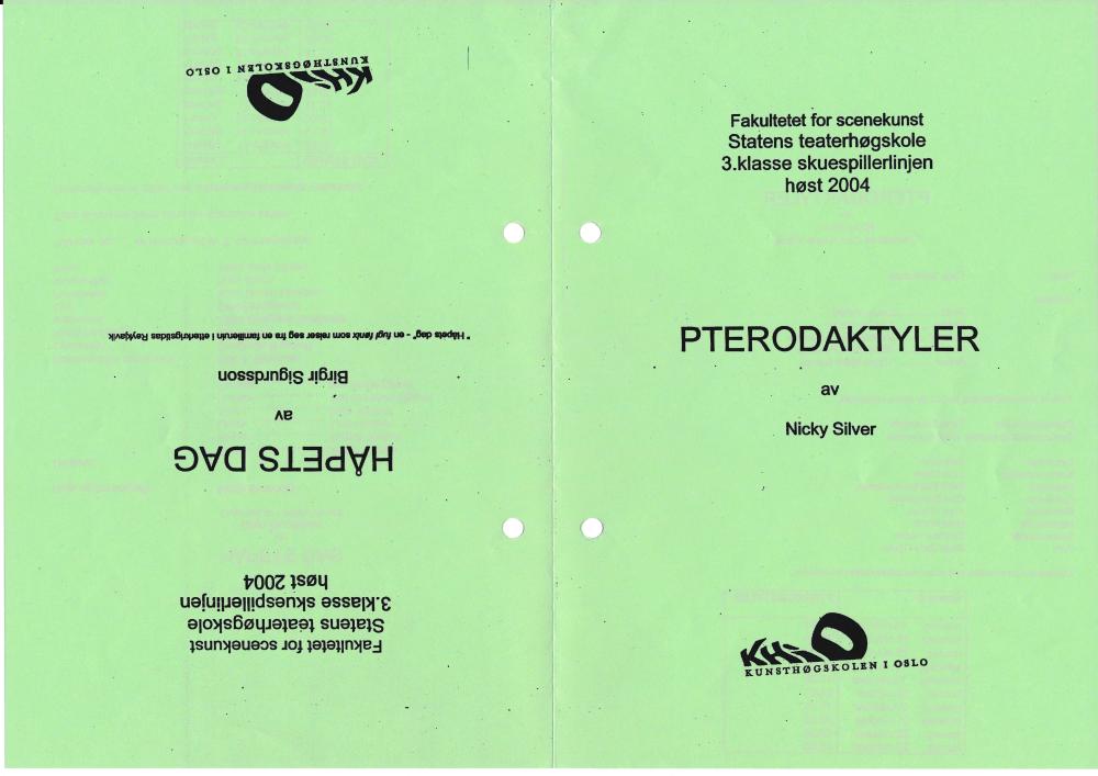 Programforside til Statens teaterhøgskoles visning Pterodaktyler (2004) med studenter fra 3.klasse skuespillerlinjen