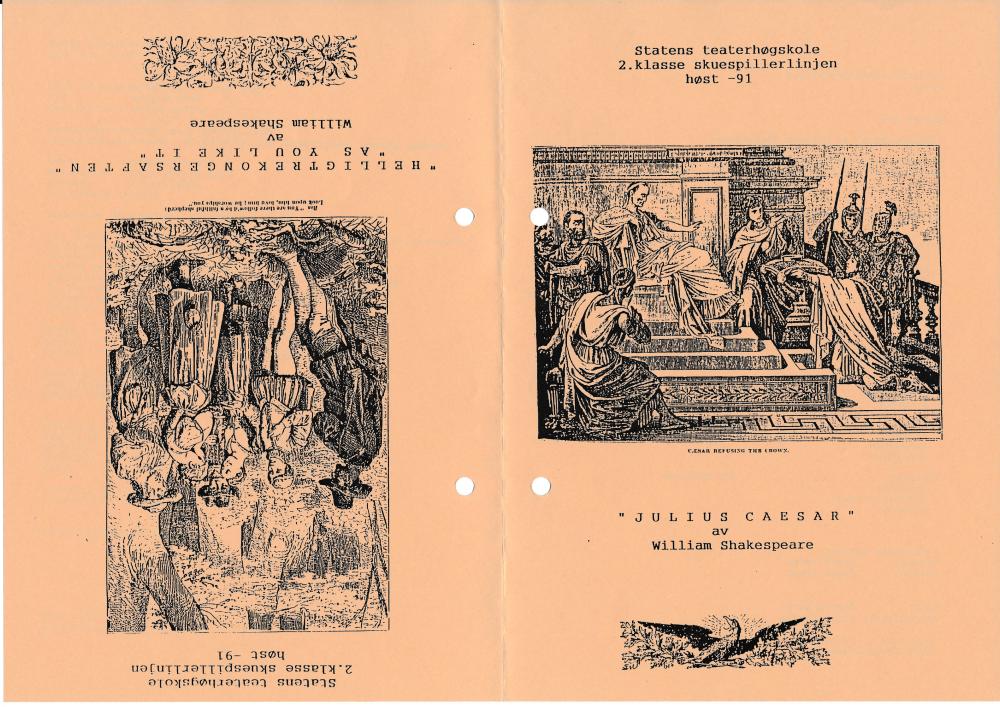 Programforside til Statens teaterhøgskoles produksjon Julius Cæsar - utdrag (1991) med studenter fra 2.klasse skuespillerlinjen, som var del av Shakespeare-perioden 1991.