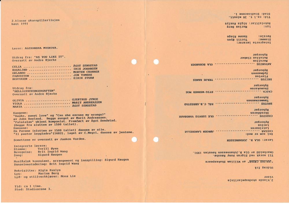 Program til Statens teaterhøgskoles produksjon Helligtrekongersaften og As You Like It - utdrag (1991) med studenter fra 2.klasse skuespillerlinjen.