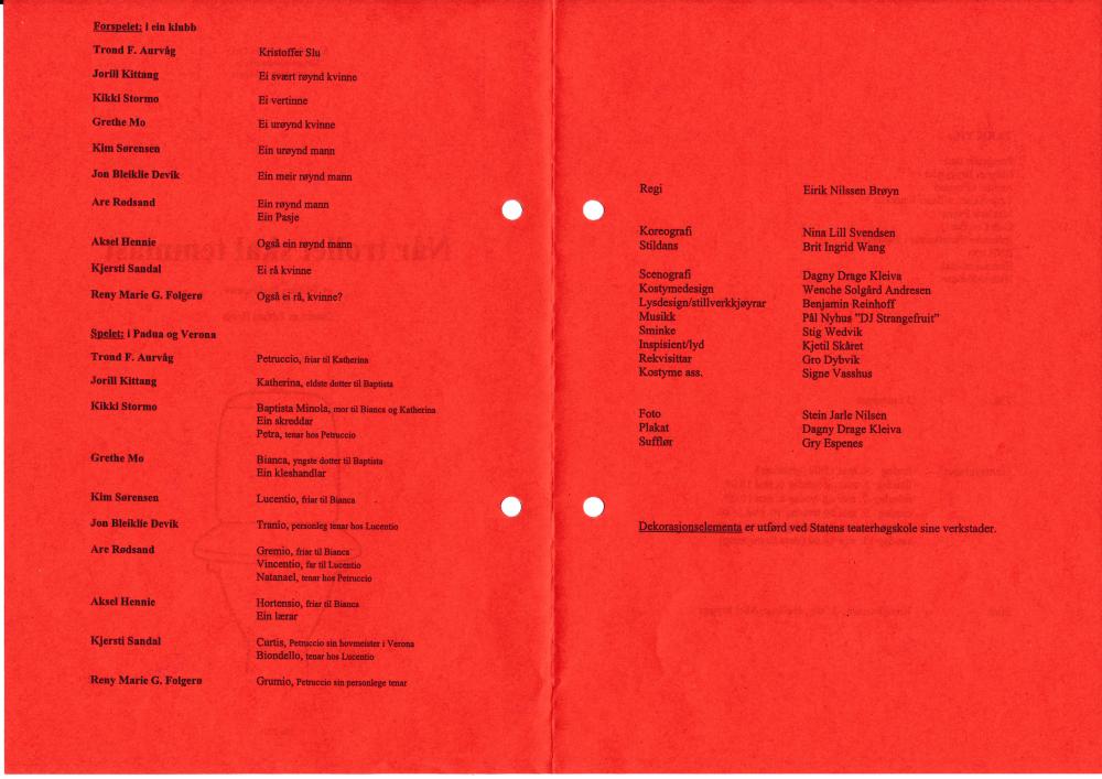 Program til Statens teaterhøgskoles studentproduksjon Når trollet skal temmast (2001) med 3.klasse skuespillerlinjen.