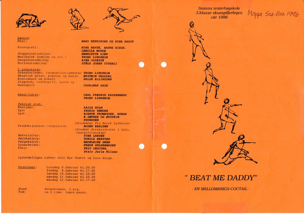 Program til Statens teaterhøgskoles produksjon Beat Me Daddy - en mellomkrigscoctail (1996), sang- og danseprogram med 3.klasse skuespillerlinjen.