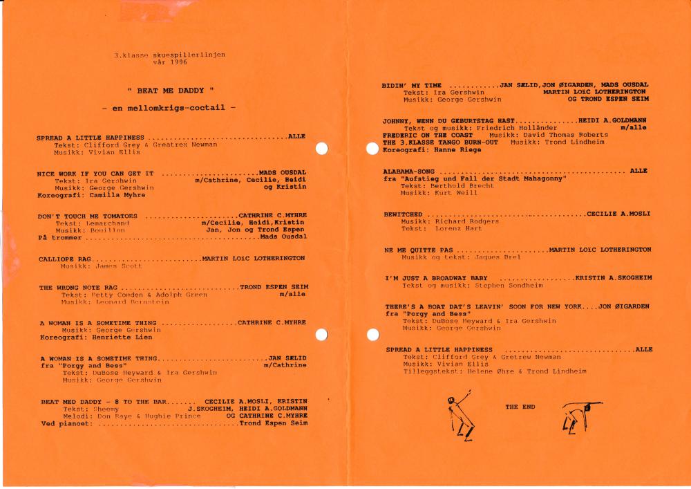 Program til Statens teaterhøgskoles produksjon Beat Me Daddy - en mellomkrigscoctail (1996), sang- og danseprogram med 3.klasse skuespillerlinjen.