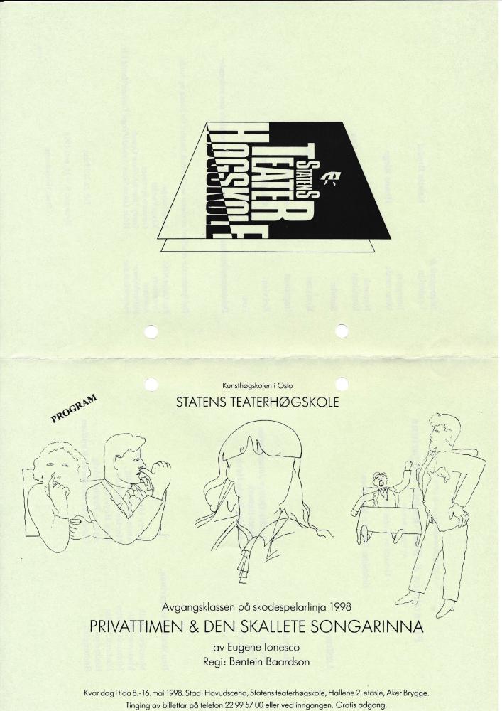 Programforside til Statens teaterhøgskoles produksjon Privattimen & Den skallete songarinna (1998)