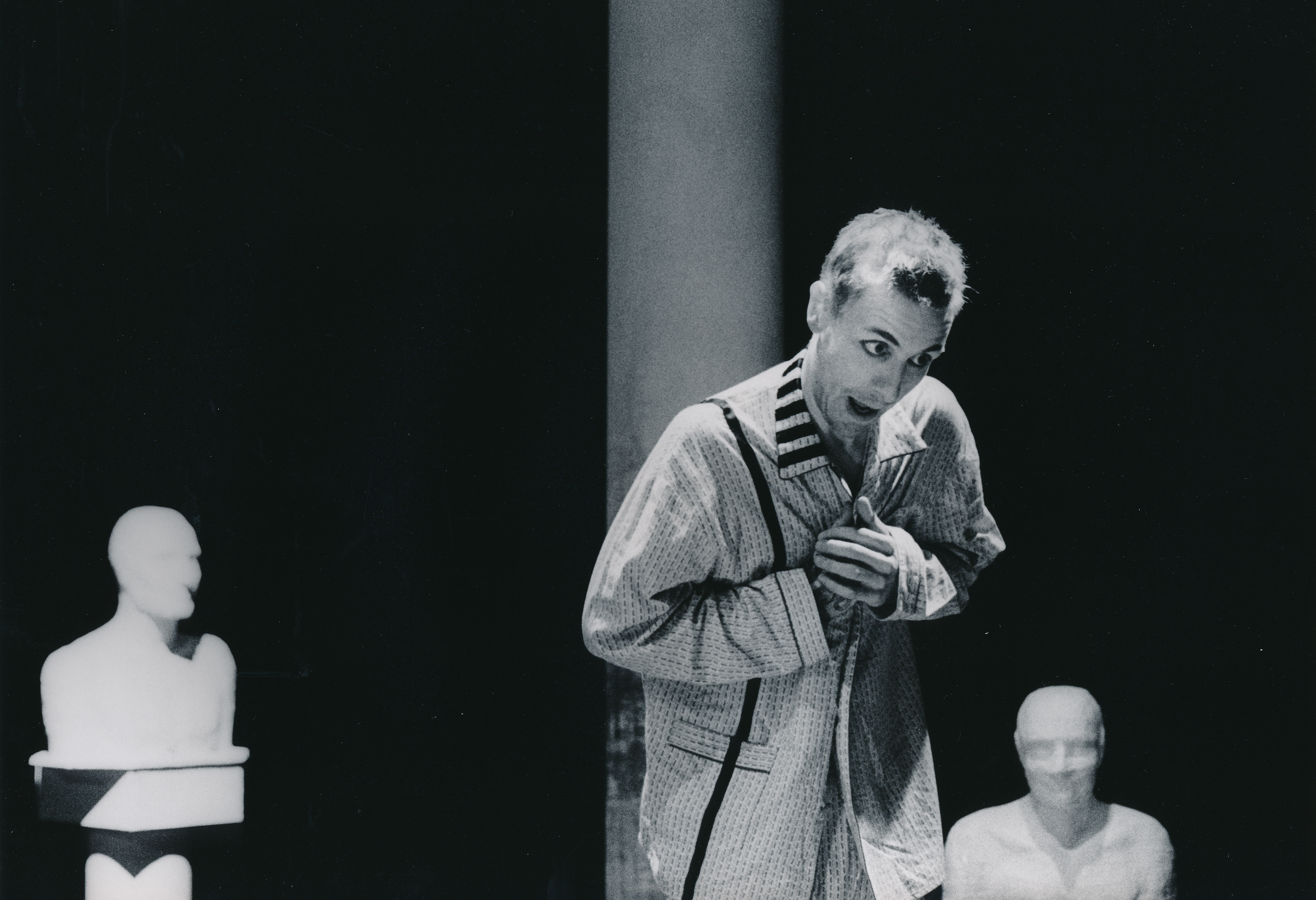 Fotografi fra Statens teaterhøgskoles studentproduksjon En lykkelig begivenhet (1997) med student fra 3.klasse instruktørlinjen og studenter fra 2.klasse skuespillerlinjen.