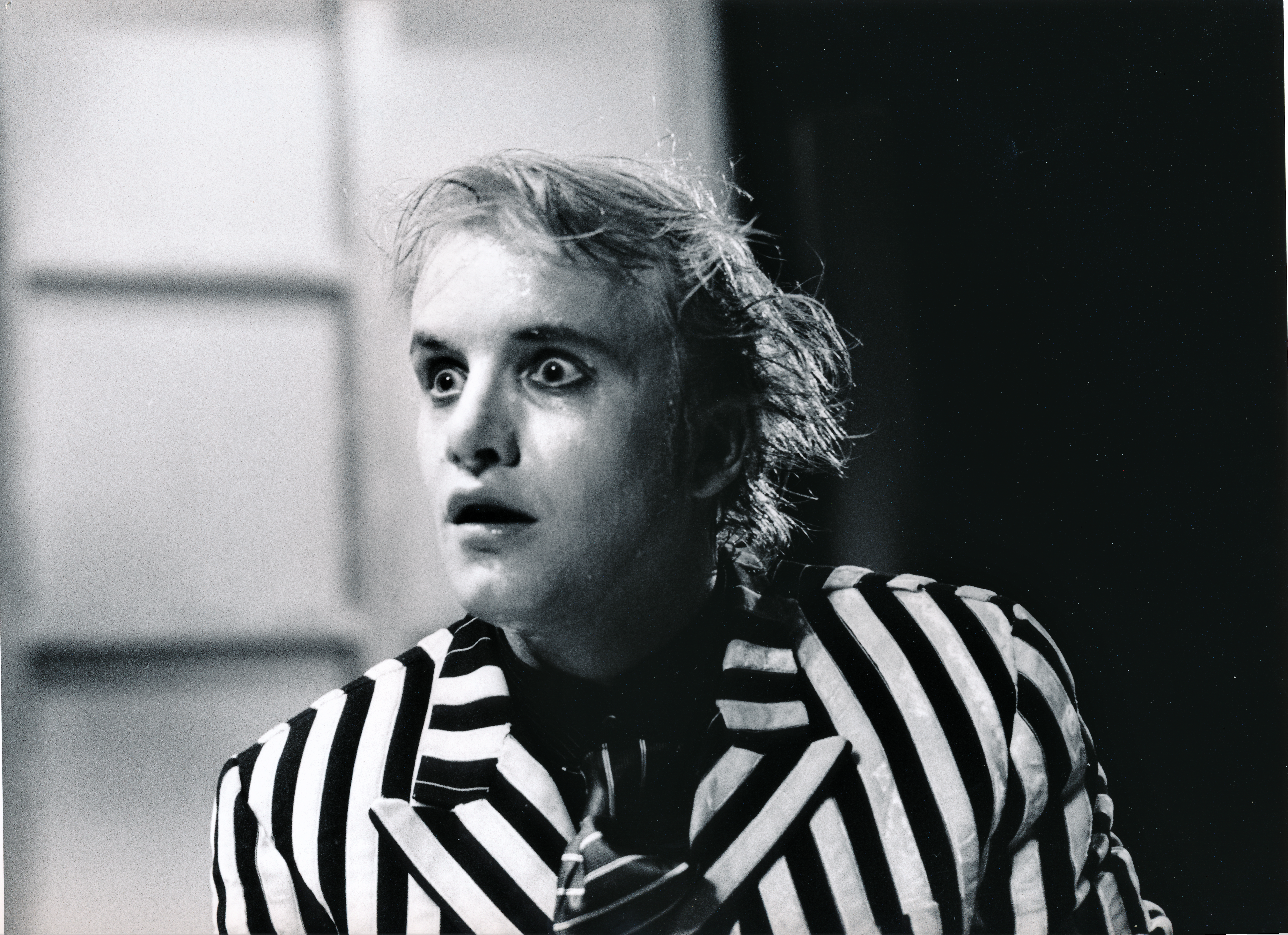 Fotografi fra Statens teaterhøgskoles studentproduksjon En lykkelig begivenhet (1997) med student fra 3.klasse instruktørlinjen og studenter fra 2.klasse skuespillerlinjen.
