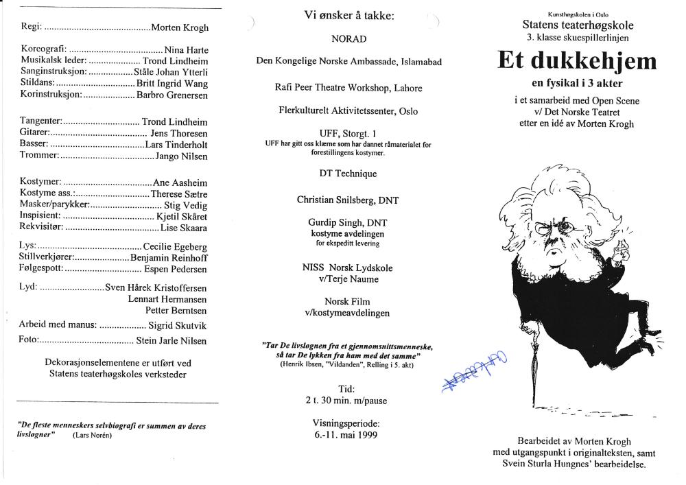 Program til Et dukkehjem - en fysikal i tre akter (1999), som var et samarbeidsprosjekt mellom Statens teaterhøgskole, 3.klasse skuespillerlinjen og Open Scene ved Det Norske Teatret.