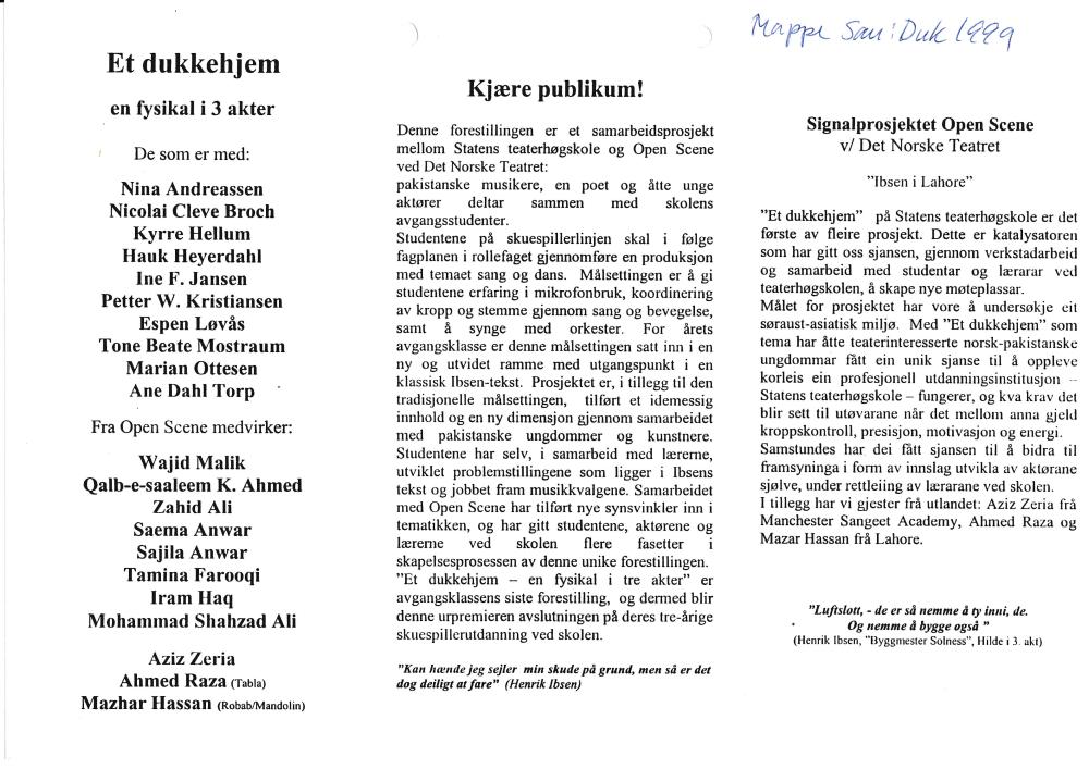 Program til Et dukkehjem - en fysikal i tre akter (1999), som var et samarbeidsprosjekt mellom Statens teaterhøgskole, 3.klasse skuespillerlinjen og Open Scene ved Det Norske Teatret.