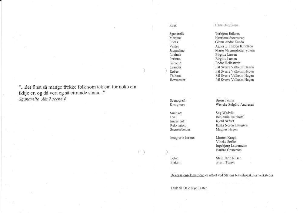 Program til Statens teaterhøgskoles studentproduksjon Doktor mot sin vilje (2003) med 3.klasse skuespillerlinjen.