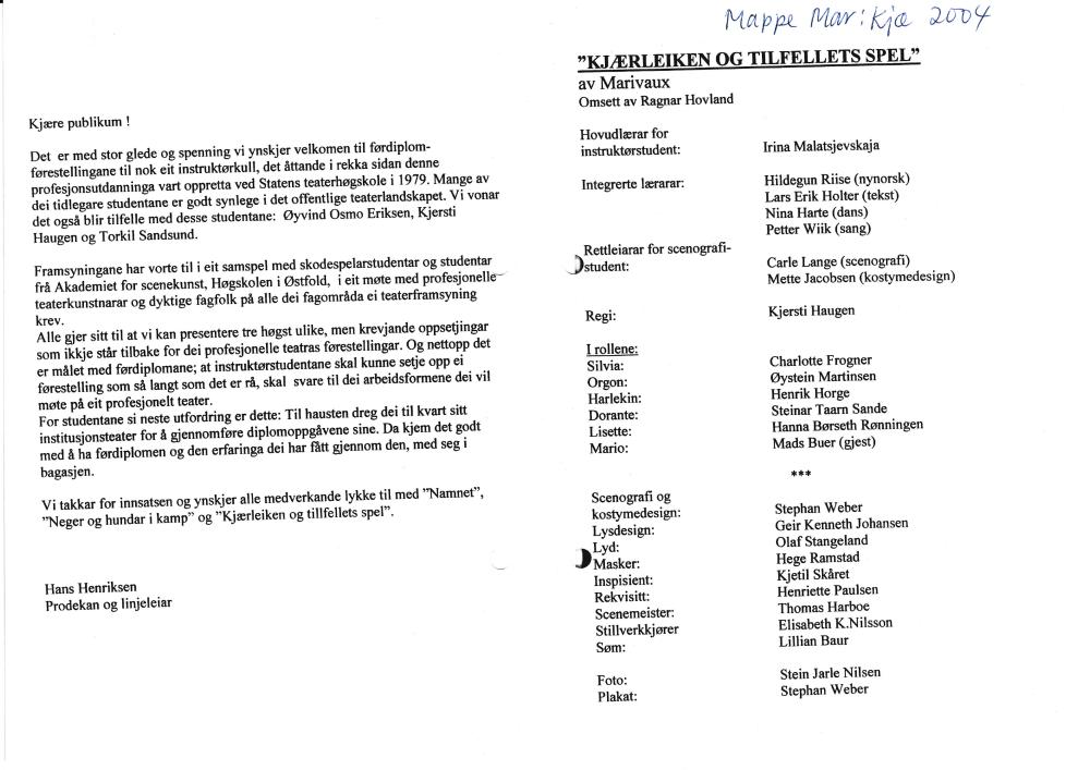 Program til Statens teaterhøgskoles studentproduksjon Kjærleiken og tilfellets spel (2004) med student fra 3.klasse instruktørlinja, 3.klasse skuespillerlinja og gjest.