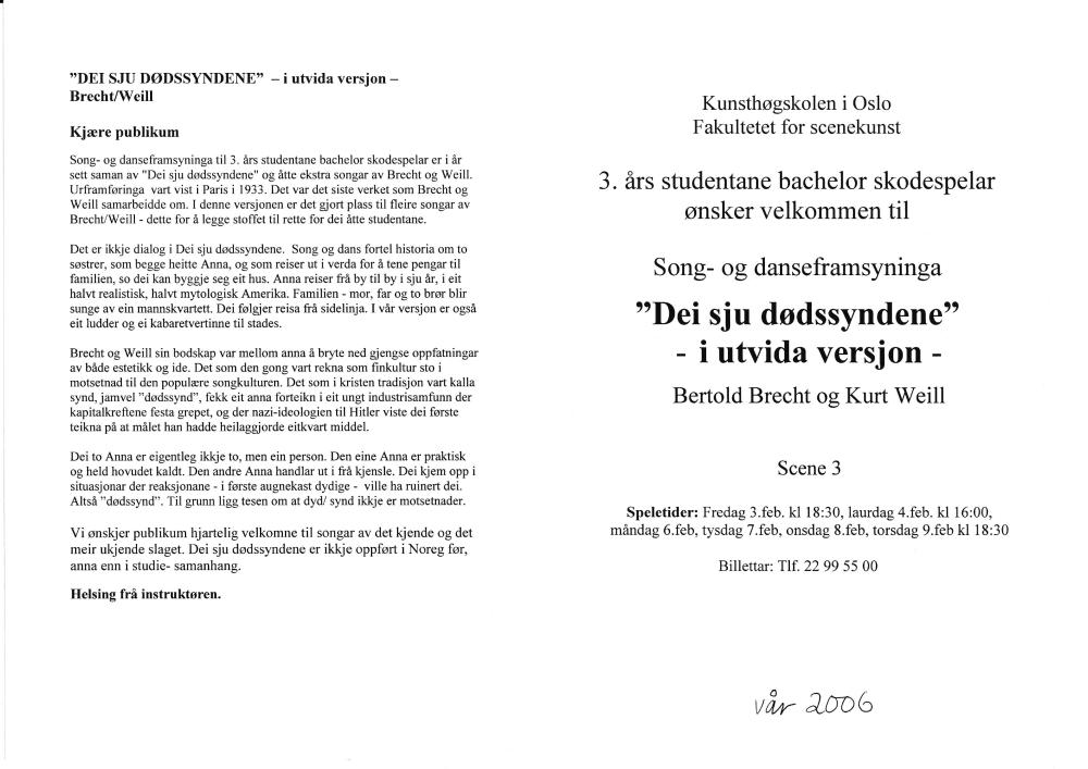 Program til 3.år bachelor skuespillere, Fakultet for scenekunst studentproduksjon Dei sju dødssyndene - utvida versjon (2006)