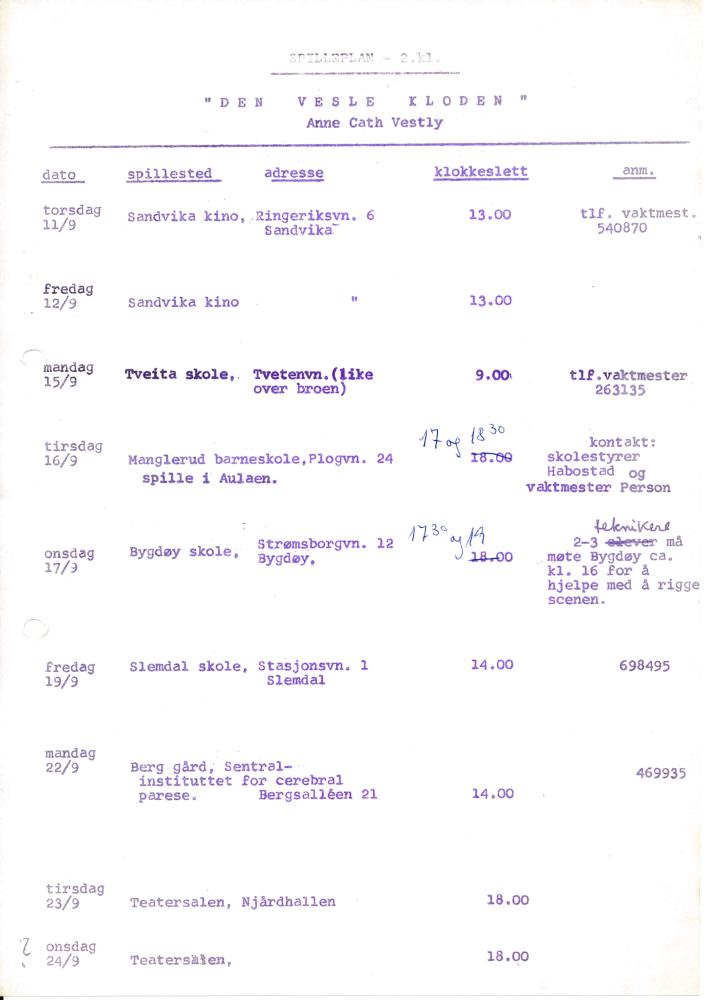 Spilleplan Den vesle kloden med 2.klasse skuespillerlinjen (1970)