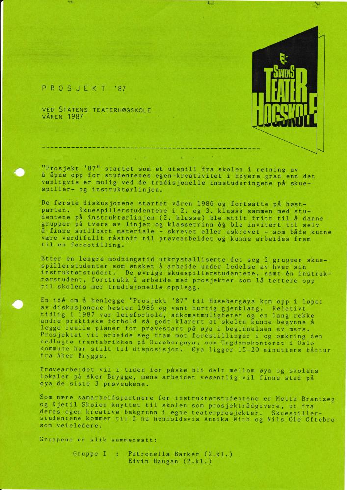 | Emneord | 2. klasse, 3. klasse, Instruktørlinjen, Skuespillerlinjen, Prosjektbeskrivelse, Teater |