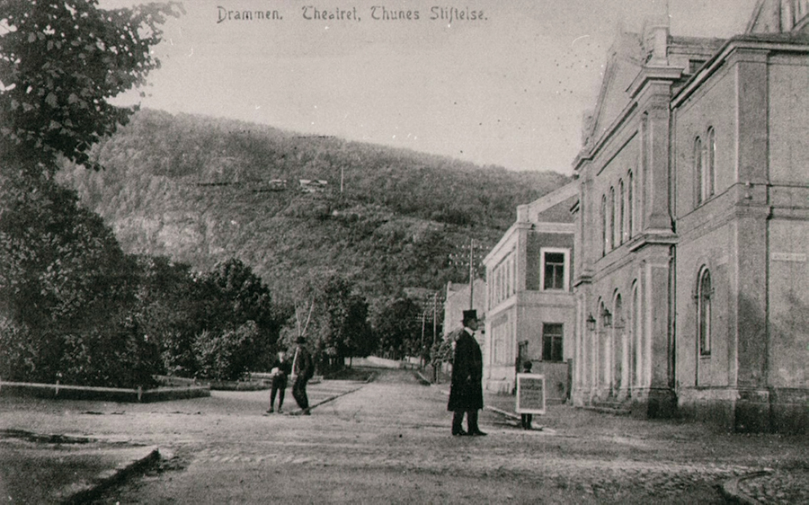 Fotografi av Drammens Teater. Teatrets fremside, Thunegården og Gamle Kirkeplass i 1908. På fjellsiden kan du også skimte Åspaviljongen.