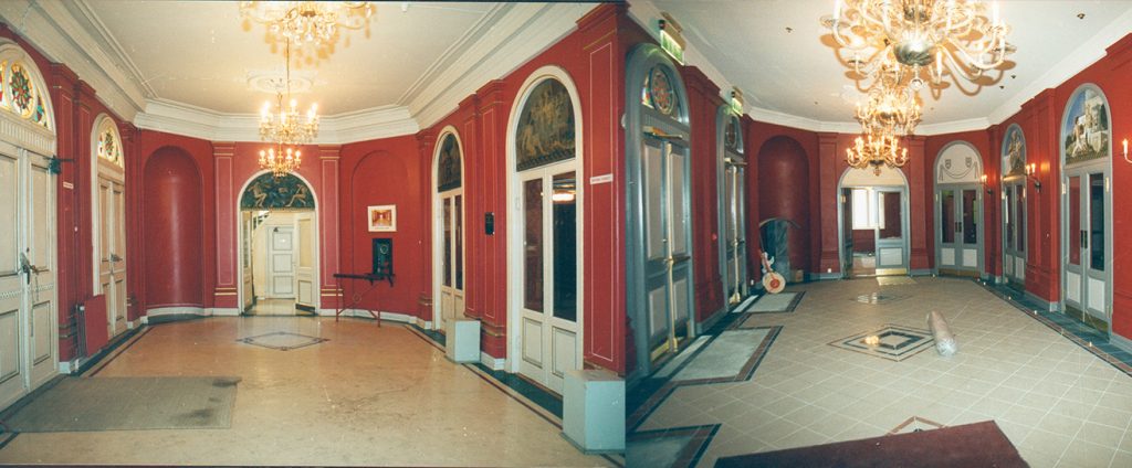 Fotografi av Drammens Teaters foajé. Før og etter gjenoppbyggingen.