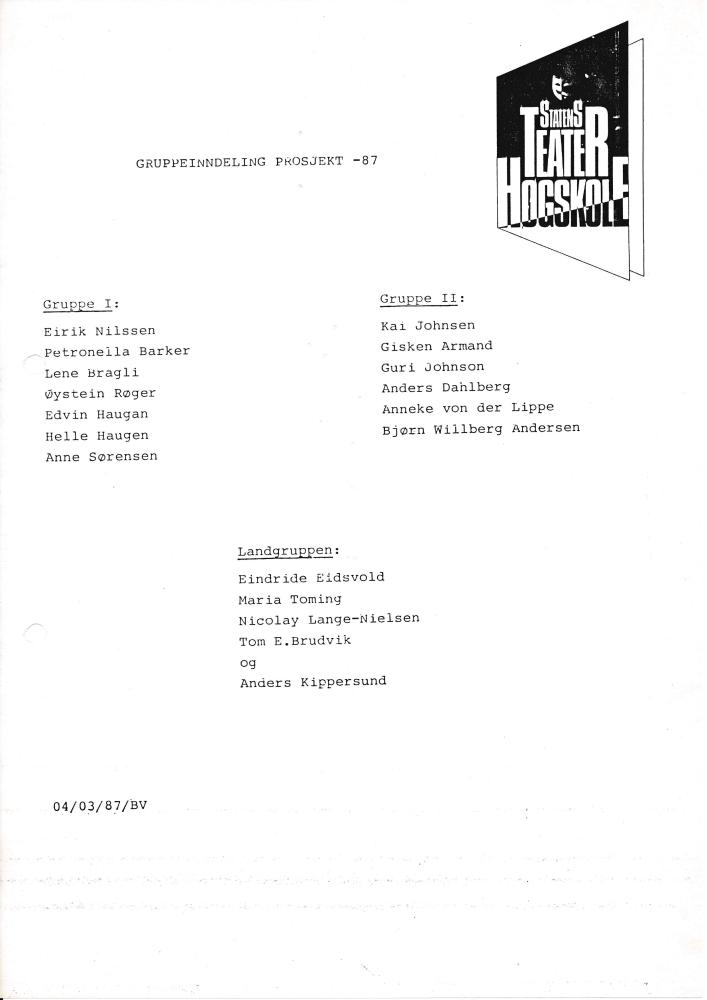 Gruppeinndeling Prosjekt - 87, Statens teaterhøgskole (1987)