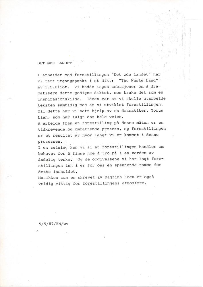 Tekst til arbeidet med forestillingen Det øde landet skrevet av instruktørstudent Eirik Nilssen (1987)