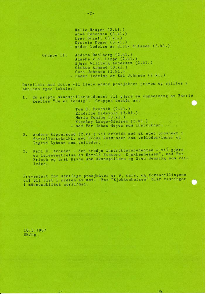 Prosektbeskrivelse, side 2 til Statens teaterhøgskoles Prosjekt - 87. (1987) med deltakere fra 2. og 3.klasse skuespillerlinjen, 2.klasse instruktørlinjen og gjester.