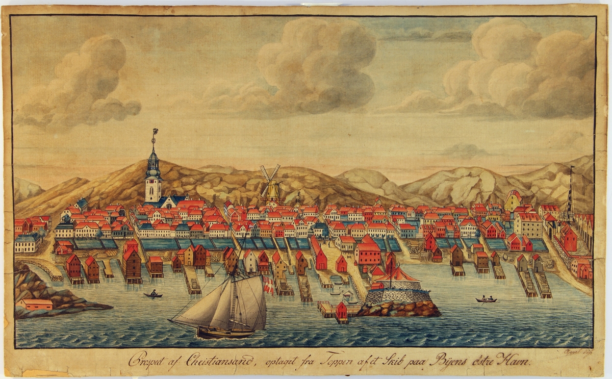 Akvarell som viser Christianssand havn i ca. 1804.