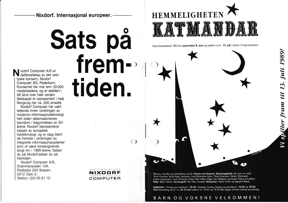 Program til Statens teaterhøgskoles 2.klasse skuespillerlinjen barneforestilling Hemmeligheten Katmandar (1989) som var sommerteater i Frognerparken.