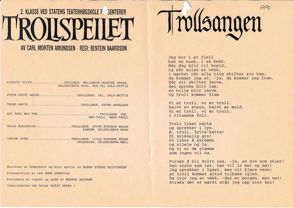 Program til 2.klasse ved Statens teaterhøgskoles barneforestilling Trollspeilet (1991)